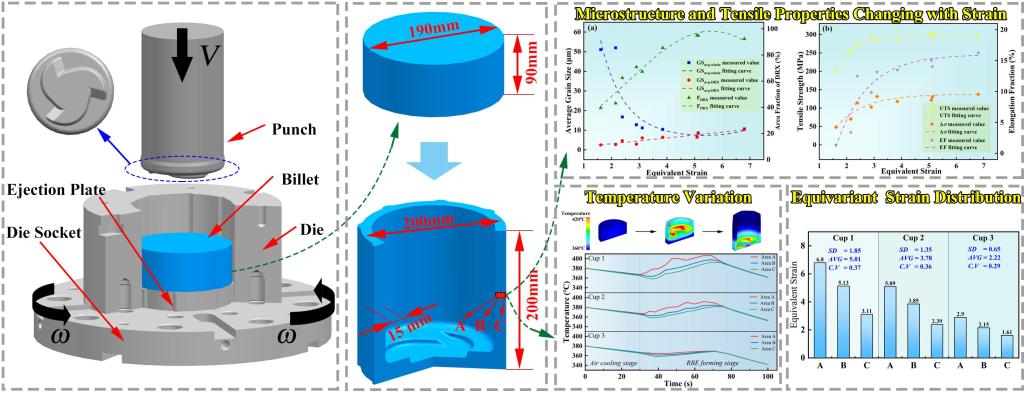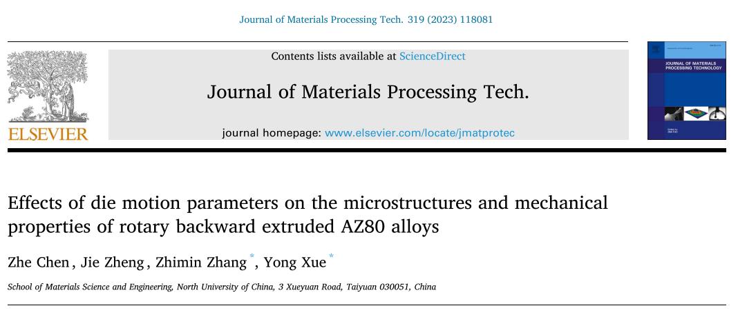 张治民教授团队,针对航空航天和国防军工装备用轻合金舱体各向异性大的痛点,提出了旋转挤压成形新技术,有限元模拟结合物理实验,精确设计与控制成形件的温度场及应变场,在自主研发的国内外首台多向加载旋转挤压机上,加工出弱各向异性镁合金舱体。成果报道于制造领域顶刊《Journal of Materials Processing Technology》(链接://doi.org/10.1016/j.jmatprotec.2023.118081)。我校世博娱乐