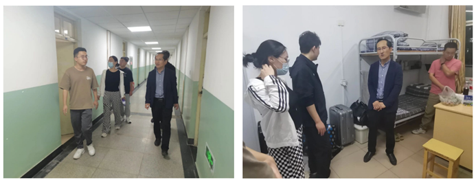 为及时了解新生思想动态、心理状况及新生宿舍卫生情况,确保学生管理工作有序、平稳开展和推进,2023年9月15日晚八点,世博娱乐党委书记廖海洪、院长王强、副院长刘斌、各专业负责人、院团委书记郝诗韵等领导老师兵分两路,对本科及研究生新生宿舍进行走访慰问,深入了解新生情况。