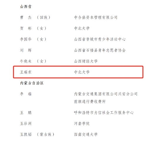 自强之星、三好学生、2022年度十佳志愿者、和林格尔县身边好人、道德模范等荣誉称号。从2017年至今,王瑞东同学参与关爱困境儿童、敬老助残、太原市马拉松、抗击疫情、无偿献血等100余项志愿服务活动,用实际行动积极践行“奉献、友爱、互助、进步”的志愿精神。