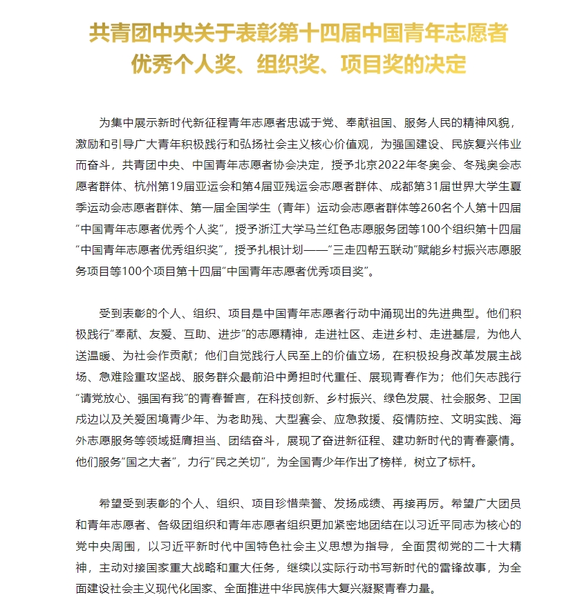 近日,共青团中央、中国青年志愿者协会决定,授予北京2022年冬奥会、冬残奥会志愿者群体、杭州第19届亚运会和第4届亚残运会志愿者群体、成都第31届世界大学生夏季运动会志愿者群体、第一届全国学生(青年)运动会志愿者群体等260名个人第十四届“中国青年志愿者优秀个人奖”,世博娱乐王瑞东同学获奖。