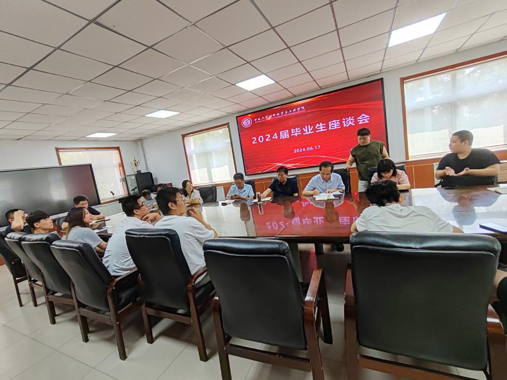 在学院会议室召开毕业生座谈会。院党委书记廖海洪、副院长刘斌、团委书记郝诗韵及各个专业老师们与各专业学生代表进行了亲切的交谈。团委书记郝诗韵老师主持本场座谈会。