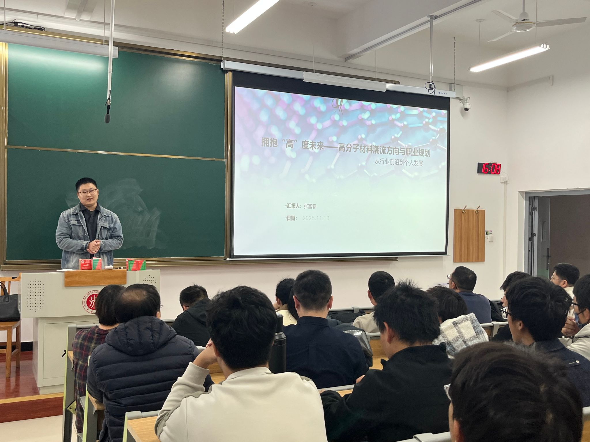活动特别邀请优秀校友张富春先生作专题分享。他以“拥抱‘高’度未来——高分子潮流方向与职业规划”为题,从行业前沿到个人发展层层递进:先深度剖析高分子领域的前沿技术突破与市场应用前景,帮助新生建立对行业发展的宏观认知;再聚焦个人成长,从行业人才需求标准、求职核心能力储备、长期职业发展路径等方面给出具体建议,为新生规划大学学习与职业发展提供实操指南。