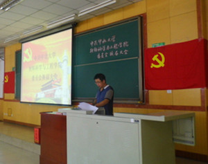 党委在09402H召开全体党员大会,进行新一届党委委员换届选举,参加会议的有上届党委委员侯华、廖海洪、冯再新和刘斌,以及学院全体师生党员,校党委组织部部长潘晋孝到会指导。会议由上届党委委员会副书记廖海洪同志主持。