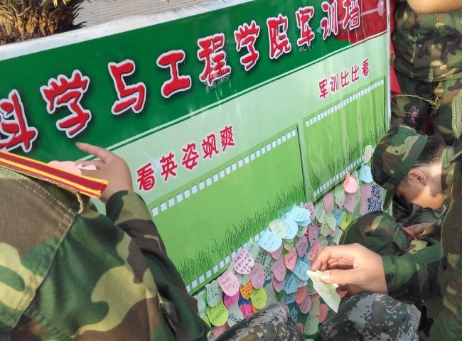 一天的军事训练结束前,同学们在老师的倡议下,在小纸条上写下军训寄语,并将其贴在世博娱乐军训墙上,实时记录了同学们的心境及感受。军训墙上承载着新生们各种话语的小纸条不失为一道亮丽的风景线。