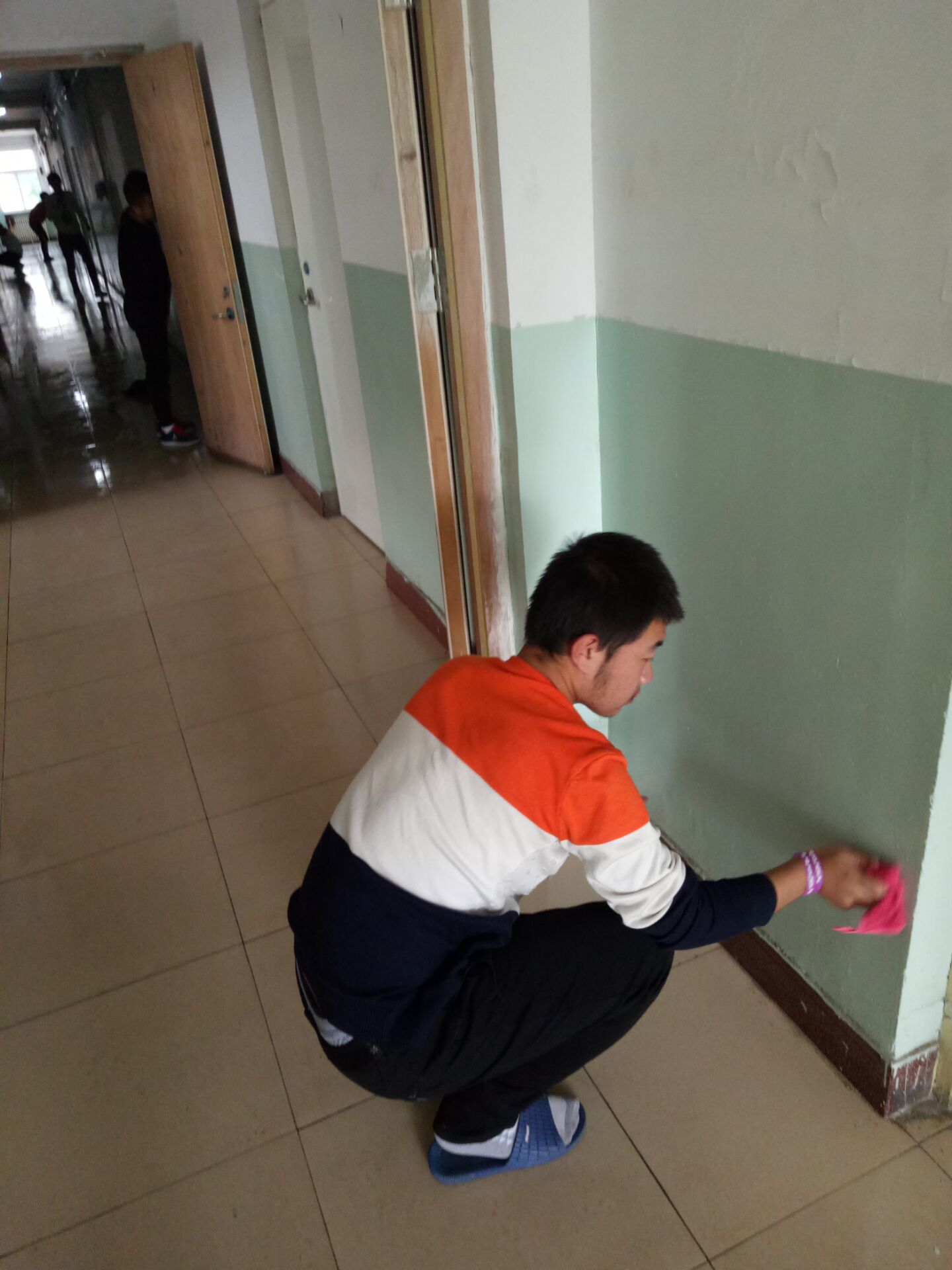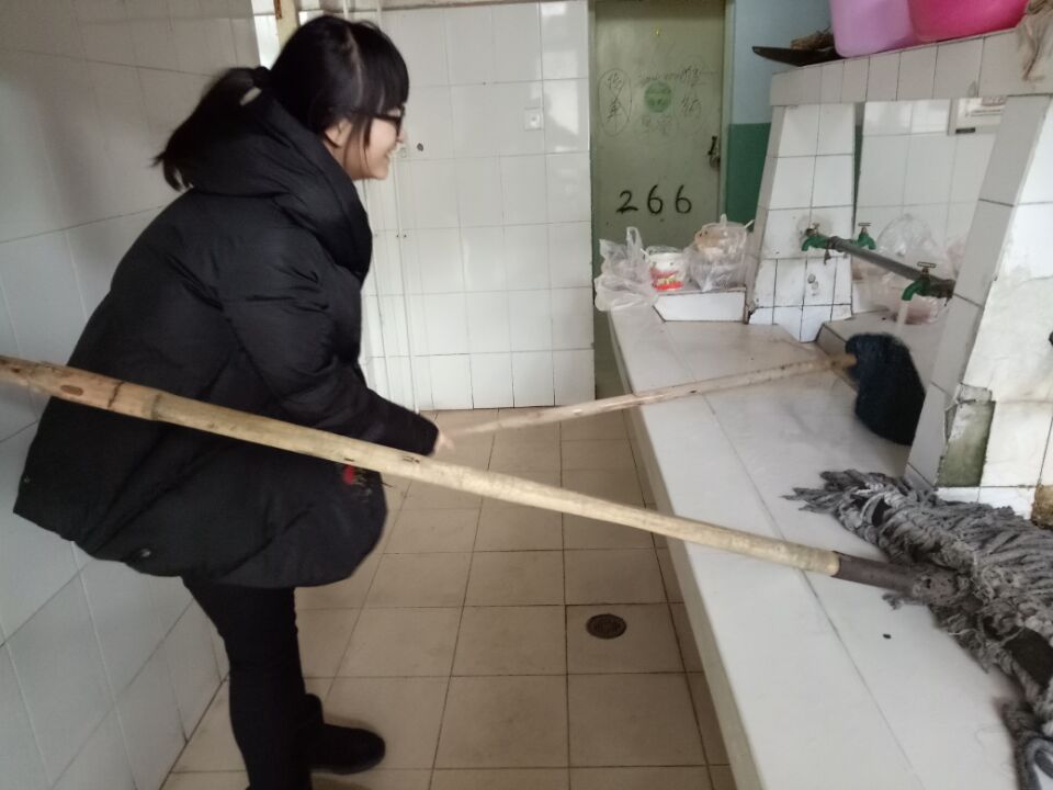 活动于下午两点半开始,在宿管阿姨分配任务之后,大家迅速地投入到了工作之中。擦墙的同学一丝不苟地清理着墙角,不放过任何一处存在灰尘的地方;拖地的同学俯下身子一步步向前,身后留下一条清洁的路面;清理楼道的同学则在认真地擦洗着扶手……所有的任务都在有条不紊地进行中,率先完成任务的同学转身去帮助未完成的同学,大家热火朝天的进行着清扫工作,最后同学们圆满完成了此次青志活动。