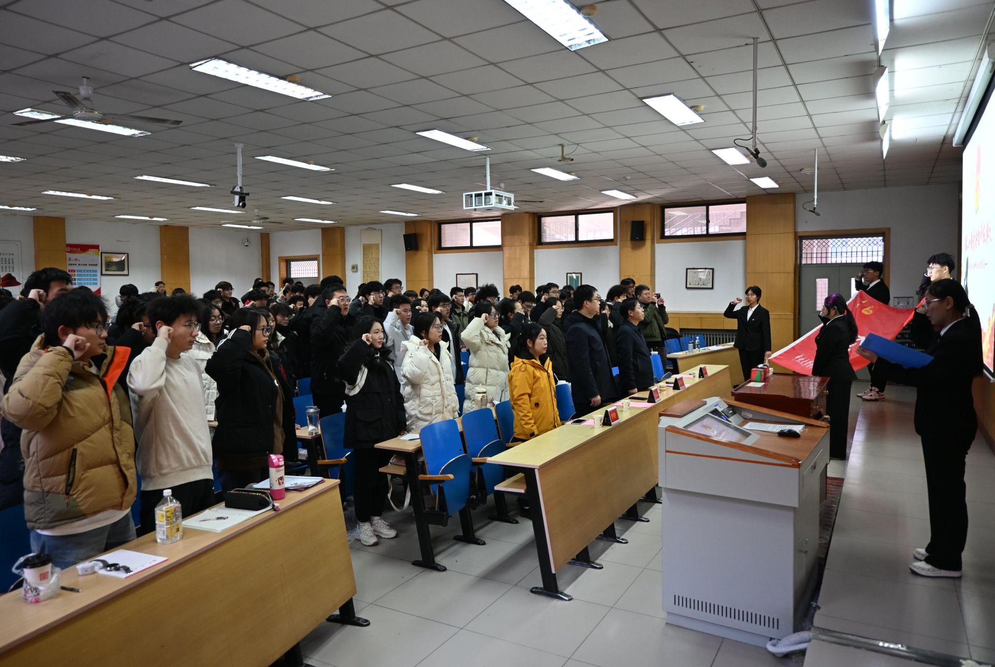 典礼尾声,党委副书记辛振东向学生代表郑重授旗。旗帜承载责任使命,激励学员奋勇争先。随后,全体学员在组织部部长田震带领下宣誓,誓言铿锵有力,为典礼注入精神动力。