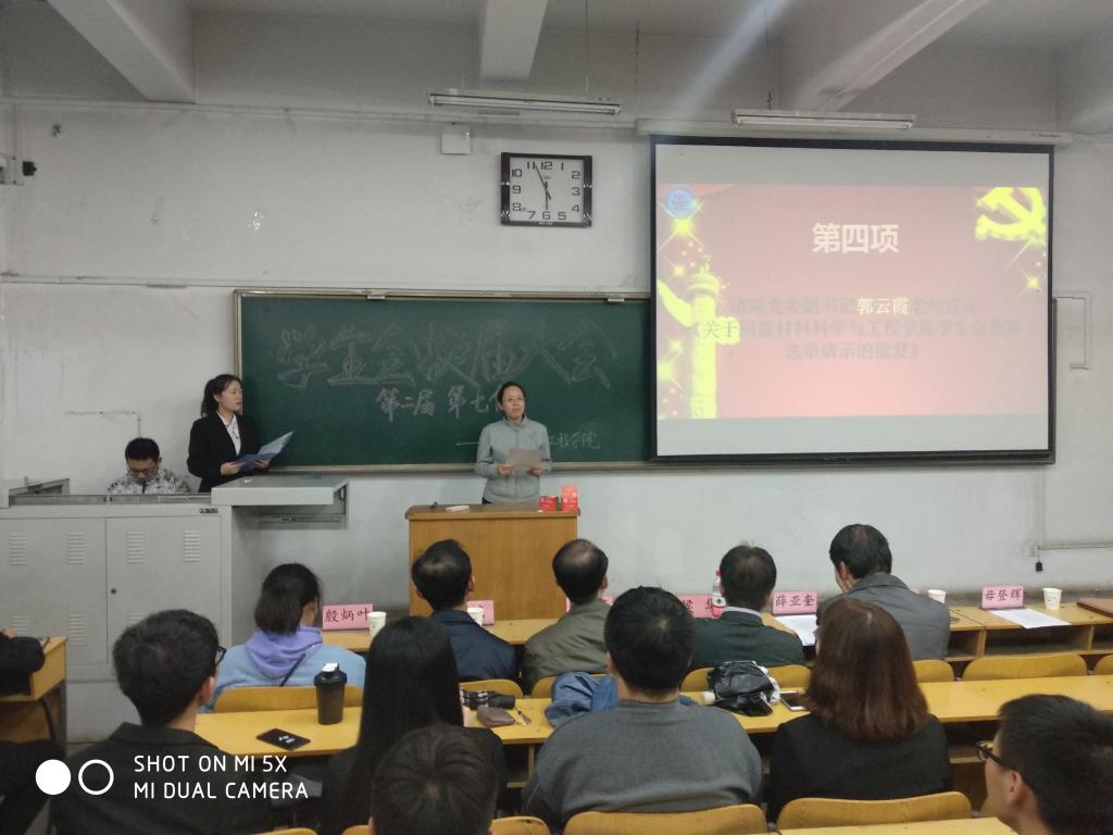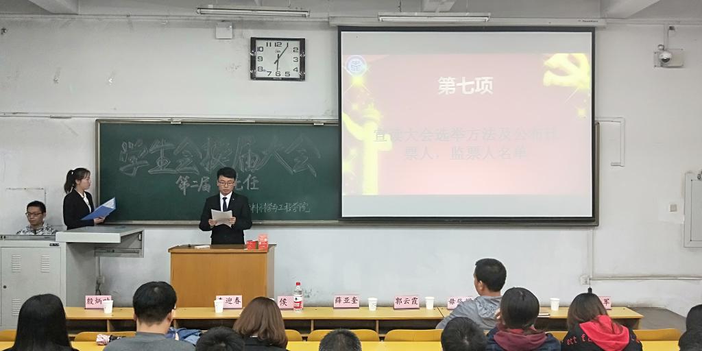 学生会的换届大会于10203H教室举办。出席本次活动的领导,老师有院党委书记薛亚奎老师,院长侯华老师,院党委副书记郭云霞老师,教学副院长李迎春老师,科研副院长刘斌老师,院团委书记毋登辉老师,学生科科长殷炳叶老师及学生科各位老师。同时,到场的还有第二届第六任团委副书记雷云超、学生会主席周文虎及其他学生会成员。