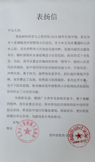张中弢同学在国家和人民需要的时候,冲锋在前,勇于作为,在抗洪抢险中不计个人得失,始终冲在抗洪一线,充分展现了新时代大学生得精神风貌,用实际行动诠释了中北材料学子的责任与担当。希望广大同学积极向张中弢同学学习,在平时的学习工作中主动作为,勇于担当,为实现中华民族伟大复兴的中国梦而贡献青春力量。