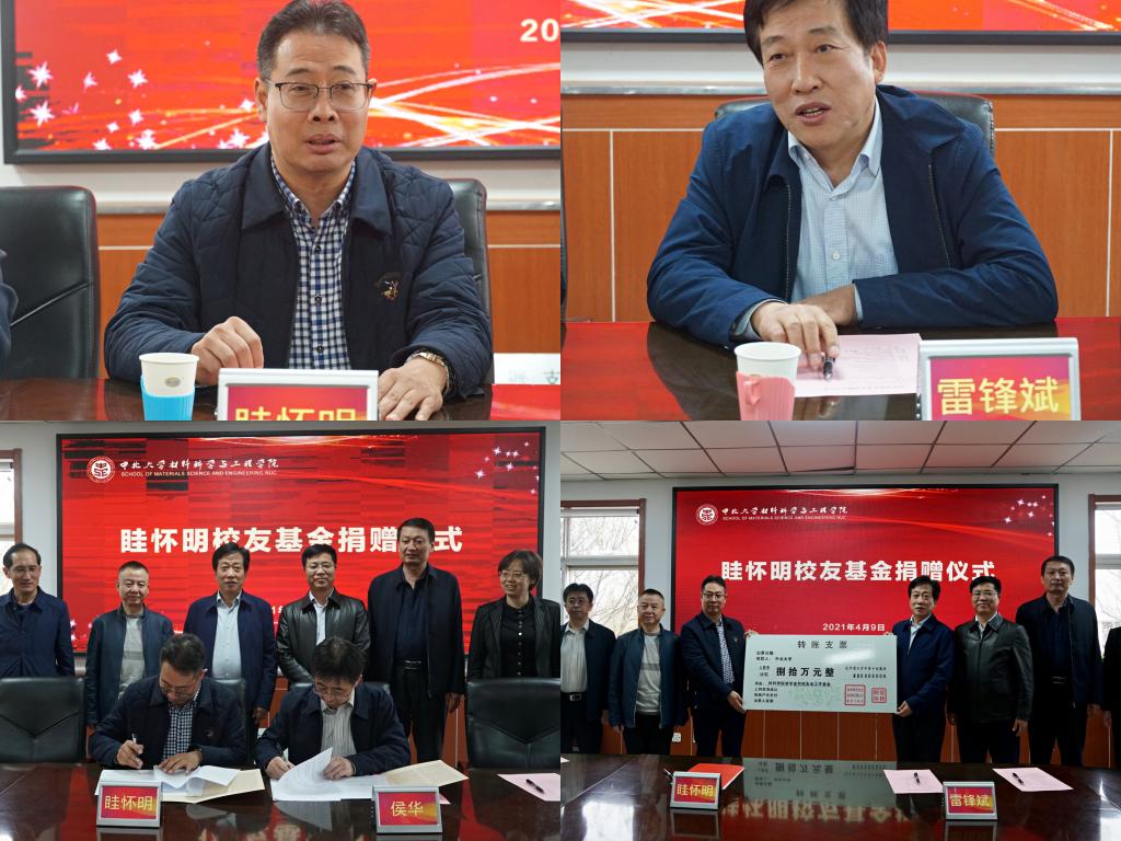 于笃学楼第一会议室举行眭怀明校友基金捐赠仪式。建校80周年即将来临之际,为表达对母校挚爱和无尽的感激,原材料科学与工程系铸造班1991级校友眭怀明重返母校,向学校捐赠80万元人民币。校党委副书记雷锋斌、党办校办主任叶玉刚、校友办主任张胜利、院党委书记薛亚奎、院长侯华、院党委副书记郭云霞、院科研副院长刘斌、校友办张琼以及部分材料师生参加了此次捐赠仪式,仪式由院党委副书记郭云霞主持。