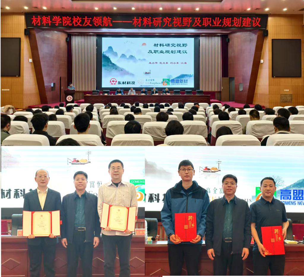 07届本科校友刘小东、11届研究生校友江涌做交流分享;一同参加本次分享活动还有北京高盟新材料股份有限公司副总经理王小平及公司研究院院长范卫东。院党委书记廖海洪出席本次分享活动并为校友及嘉宾颁发了“校友领航”育人工程导师聘书,活动由副院长李晓峰主持。